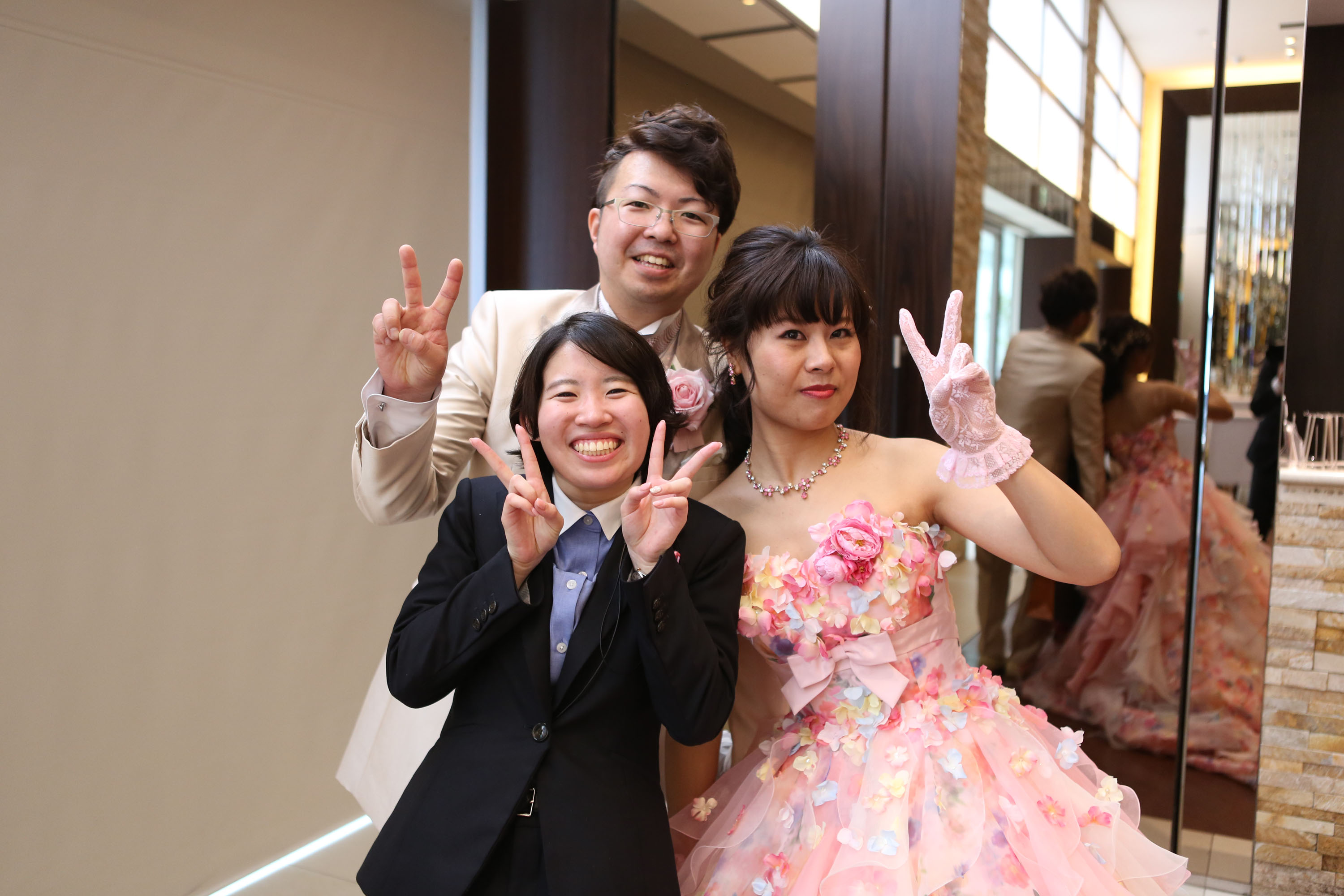 ピンクのカクテルドレスとタキシードに着替えられた