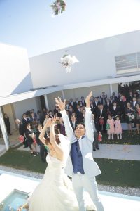 広いガーデンで全員で手を高く上げて、きれいな青空にふたりの幸せを願ってバルーンを放つ瞬間はとても気持ちが良く、見ているわたしたちまで幸せな気持ちになります^^