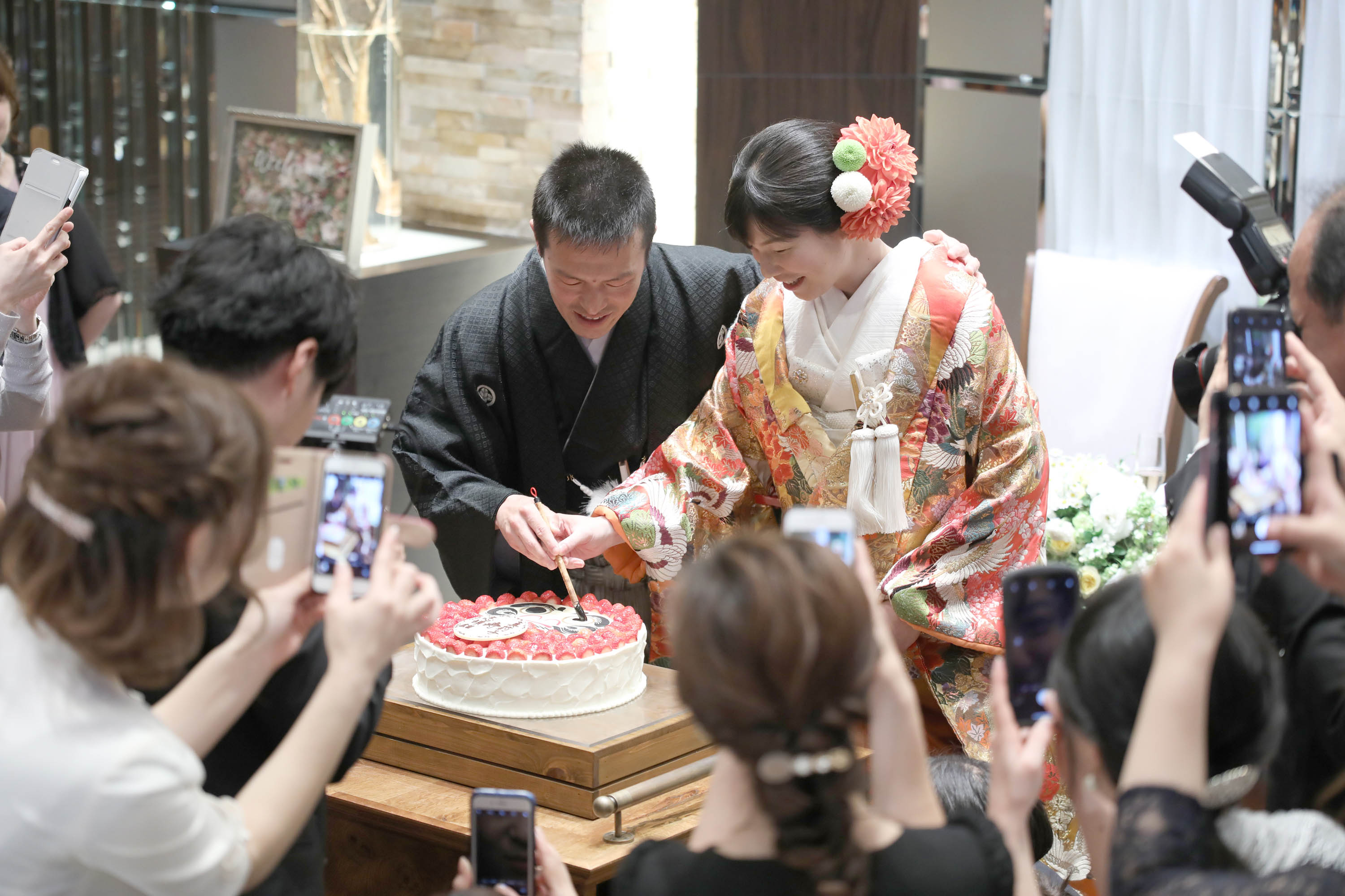 和装姿にぴったりな「だるまケーキ」をおふたりで完成させていただきます!