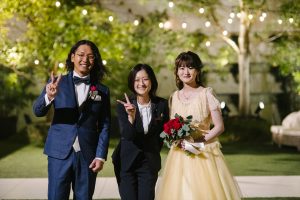 お色直しはカーキのタキシードとネイビーのカラードレスに!