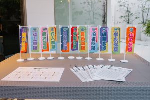 各テーブルにカラフルなのぼりが置かれひらひらと揺れる中
