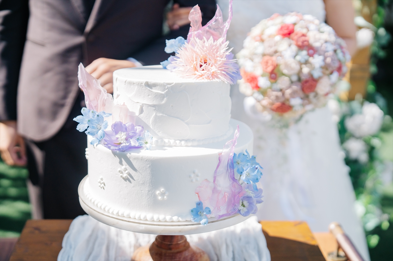 ウェディングケーキもおしゃれなライスペーパーが乗ったデザイン