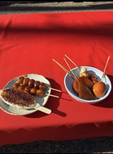 屋台には、みたらし団子だったり、名物の五平餅など様々な物がありました
