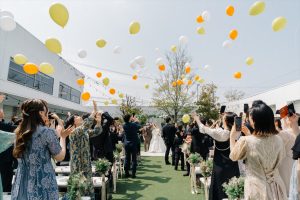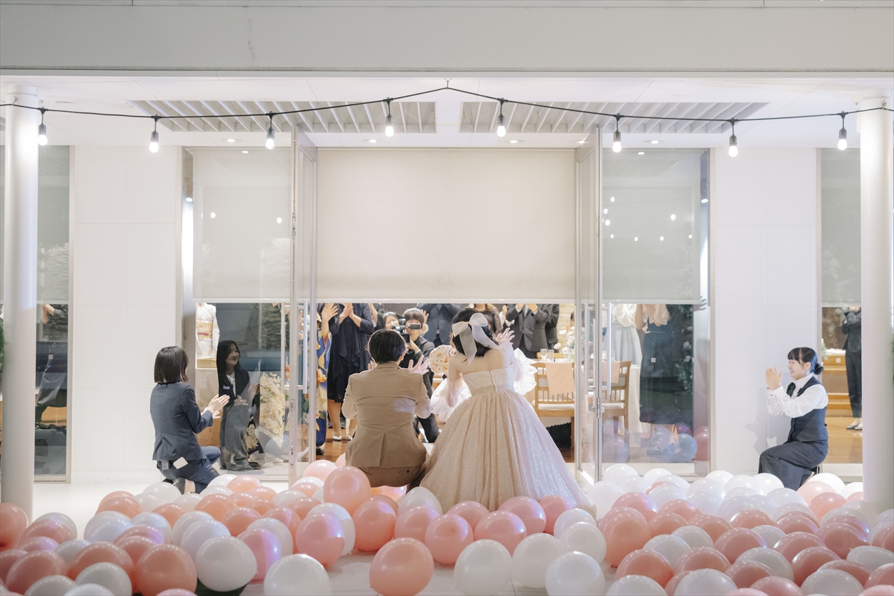 入場シーンや門出シーンで、おふたりの後ろから300球のバルーンが降ってくる、とっても可愛らしい演出です!
