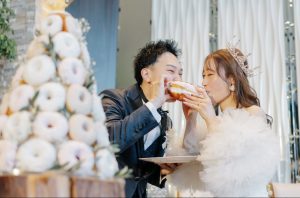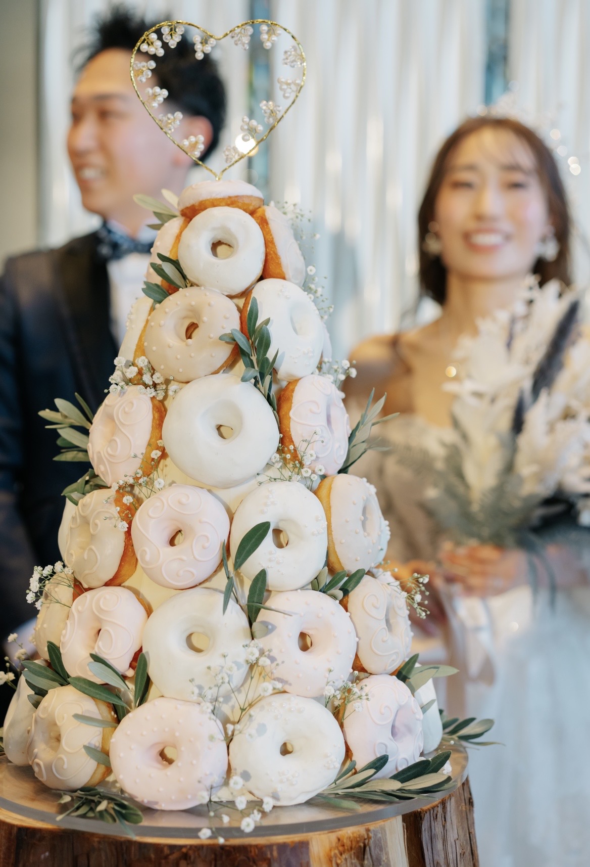 オシャレな色合いのドーナツタワーは出てきた時のインパクトも最高で、ゲストからも歓声が上がりました!作った私もおふたりのイメージしてた通りにできで大満足!可愛くオシャレにできました。
